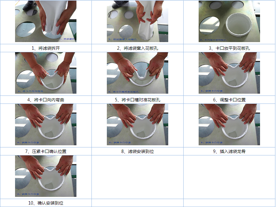 在布袋除塵器的安裝、調試工作中,除塵布袋、骨架與花孔板的安裝是全部安裝中_小心和仔細的工作,因此應放在_后進行安裝,安裝時,布袋切不可與尖硬物碰撞、鉤劃,即使是小的劃痕,也會使布袋的壽命大大縮短。安裝除塵器布袋的方法是先將布袋由箱體花板孔中放入袋室,然后將袋口上部的彈簧圈捏成凹型,放入箱體的花孔板中,再使彈簧圈復原,使其緊密地壓緊在花孔圓周上,_后將除塵器袋籠從袋口輕輕插入,直到袋籠上部的護蓋確實壓在箱體內花板孔上為止。為防止布袋踩壞,要求每裝好一個布袋,_裝一個除塵骨架。濾袋、除塵袋籠與花孔板的安裝(附圖)。