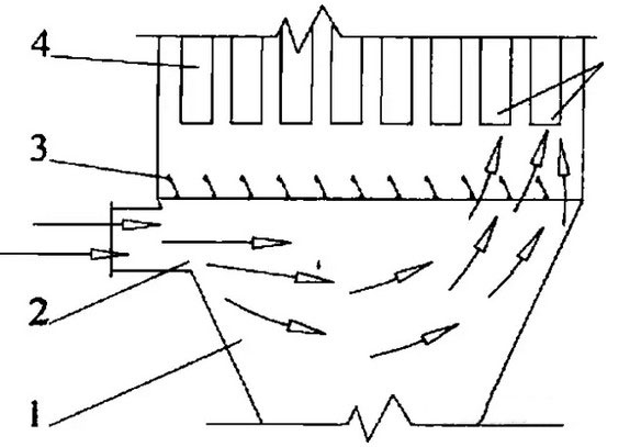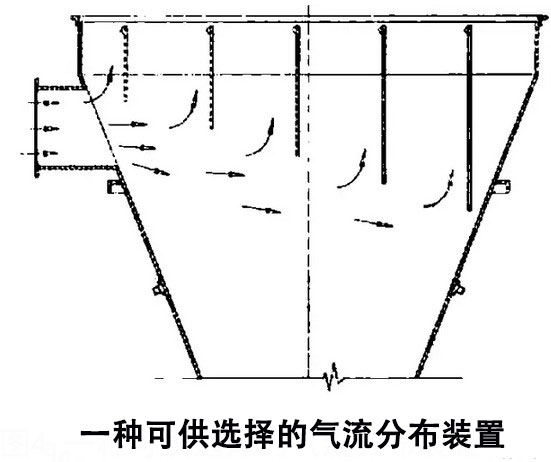 為避免上述情況,建議在條件許可時,盡量不采用灰斗進風(fēng)。若不能避免灰斗進風(fēng),圖所示 的氣流分布裝置是一種可供選擇的方案,即在灰斗中設(shè)垂直的氣流分布板,置于含塵氣流之中,使 之正面迎向含塵氣流,以削弱過高的氣流動壓。同時,垂直的氣流分布板長短不一,布置成階梯狀,使含粉塵氣體均勻分散并且像素流動.時間證明,這種裝置有效的避免了含塵氣流對濾袋的沖刷