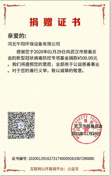 午陽環(huán)保心系武漢,為中國加油為武漢加油-河北午陽環(huán)保設(shè)備有限公司